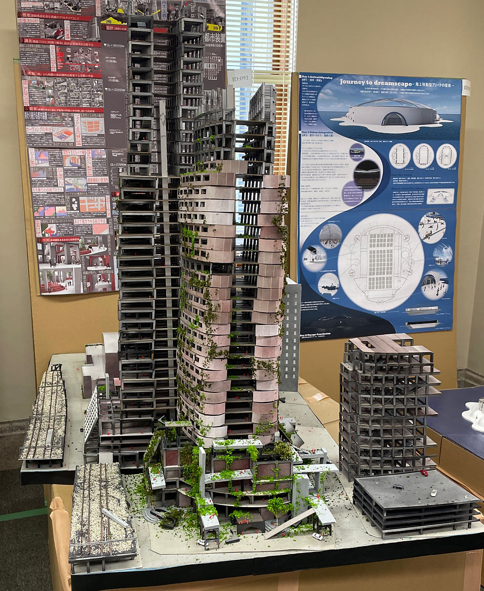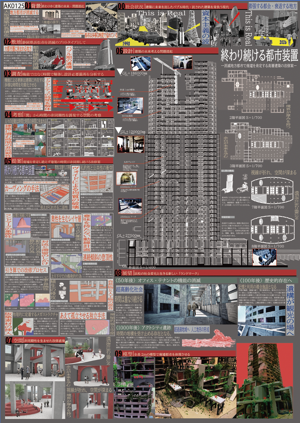あなたの故郷は数百年後消滅している。解体できない廃墟が立ち並び終末の世界を迎える。私は朽ちていくことの美学を提唱する。アクトシティ浜松という超高層建築を敷地対象とし、その中で時間軸の重なりに着目し様々な時間の交わりを誘発することにより終わり続けることをする。やがて都市装置となり、消滅地方都市に君臨し続ける。