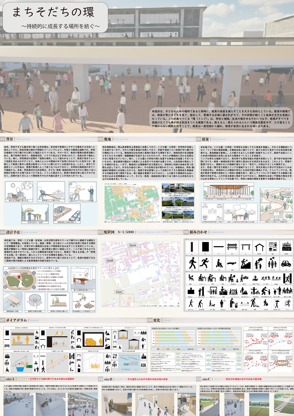 学校は安全管理の強化により地域から閉ざされ、教育や見守りの役割が校内に集中している。その結果、教員の負担は肥大化している。本計画では学校と街を横断する屋根状の帯空間「リング」を提案する。リングは子ども、教員、地域住民の活動を受け止める中間領域となり、人の流れと見守りを地域へ広げる。建築によって学校と街の関係を緩やかにつなぎ直し、教員に集中していた役割を地域へ分散することを目指す。