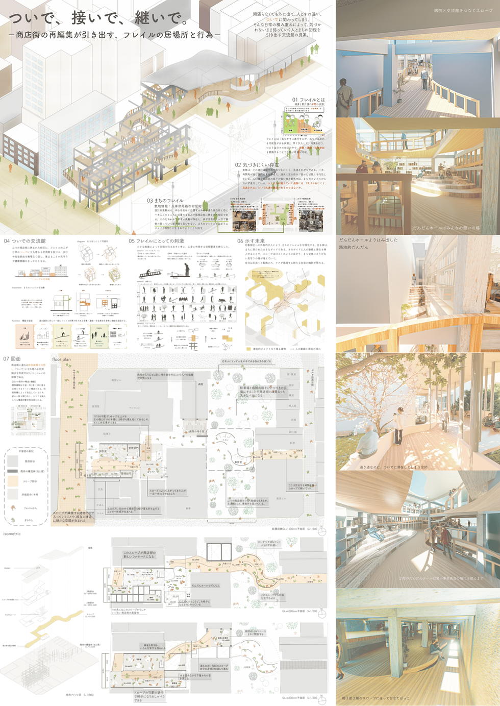 頑張らなくても外に出て、ついでに人とすれ違い、ついでに関わってしまう。そんな日常の積み重ねから、人とまちをゆっくり元気にしていく交流館の提案である。対象は姫路市の二つの商店街に挟まれた街区。表は賑わっているが、裏側は駐車場やバックヤードとなり、人の気配が薄れている。そこで裏側に、商店街をつなぐスロープ状の交流館を挿入した。三段階の勾配によって無理なく歩ける動線をつくり、ついでに歩き、ついでに関わることで、人とまちをやさしく継ぎ直す提案である。